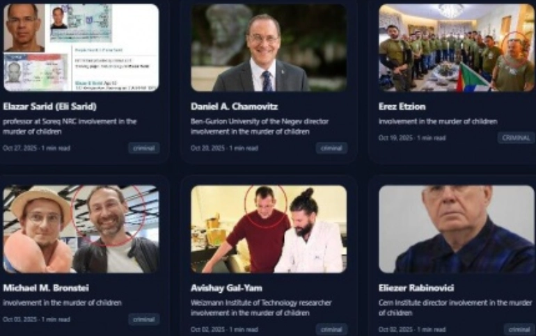 ويطالب الموقع الذي يحمل اسم "حركة العقاب من أجل العدالة" بمحاسبة قائمة بارزة من الأكاديميين والباحثين "الإسرائيليين"، تحت عناوين "مجرمون ومتعاونون مع جيش الاحتلال"، و"مروّجو أسلحة دمار شامل للجيش الإسرائيلي"، و"متورطون في قتل أطفال فلسطينيين".