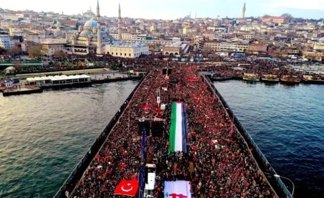 تجمّع نحو 520 ألف شخص، اليوم الخميس، في أول أيام 2026، عند جسر غلطة في إسطنبول، للمشاركة في مسيرة حاشدة تضامنًا مع فلسطين.