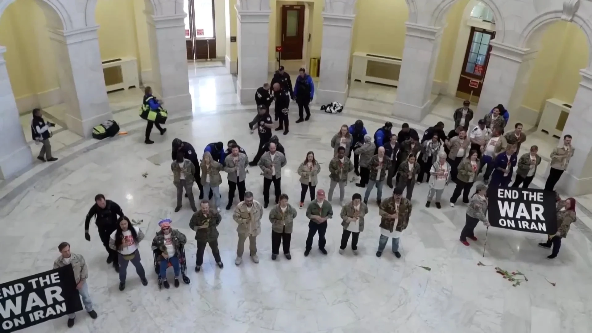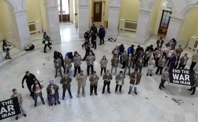 احتشد عدد من أعضاء تحالف يضمّ قوى متعدّدة، بينهم محاربون قدامى، داخل مستديرة مجلس النواب الأميركي، احتجاجاً على "الحرب على إيران، والإبادة الجماعية في فلسطين، والتطهير العرقي في جنوب لبنان، والعملية العسكرية المحتملة في كوبا".