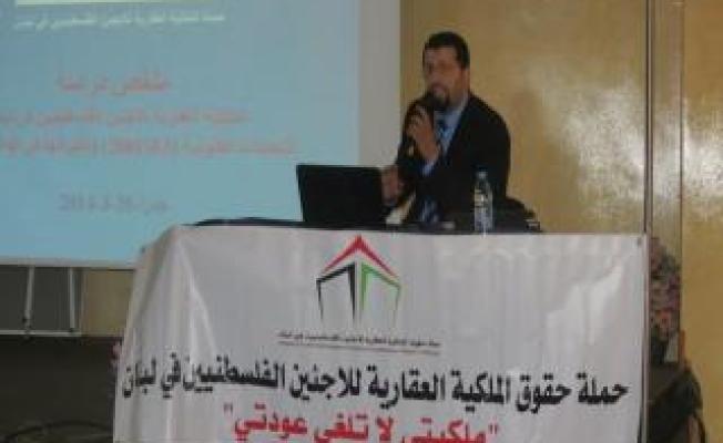 وأدارت الندوة منسقة الحملة فرح الكزلي، التي عرَفت عن الحملة وأهدافها، وقدمت الكاتب سامر مناع، الذي عرض ملخص دراسة الملكية العقارية للاجئين الفلسطينيين في لبنان "التعديلات القانونية وتأثيراتها في الواقع المعاش"، وتضمن الشق القانوني عدة محاور منها: الأطراف المعنية التي لها علاقة بالحق العقاري للاجئين الفلسطينيين، التعريفات القانونية الخاصة بموضوع التملك، الانتشار العقاري للاجئين الفلسطينيين داخل المخيمات وخارجها، القوانين اللبنانية للحقوق العقارية لغير اللبنانيين، بالإضافة إلى التوطين: مفهومه ودوره المستخدم في منع الحقوق العينية العقارية للاجئين الفلسطينيين وعلاقته بالملكية، ومحاولة 9 نواب لبنانيين استصدار تعديل قانوني جديد، وتضارب هذا القانون مع الدستور اللبناني ذاته، ومع الإعلان العالمي لحقوق الإنسان والإتفاقات الدولية والقوانين الإنسانية".